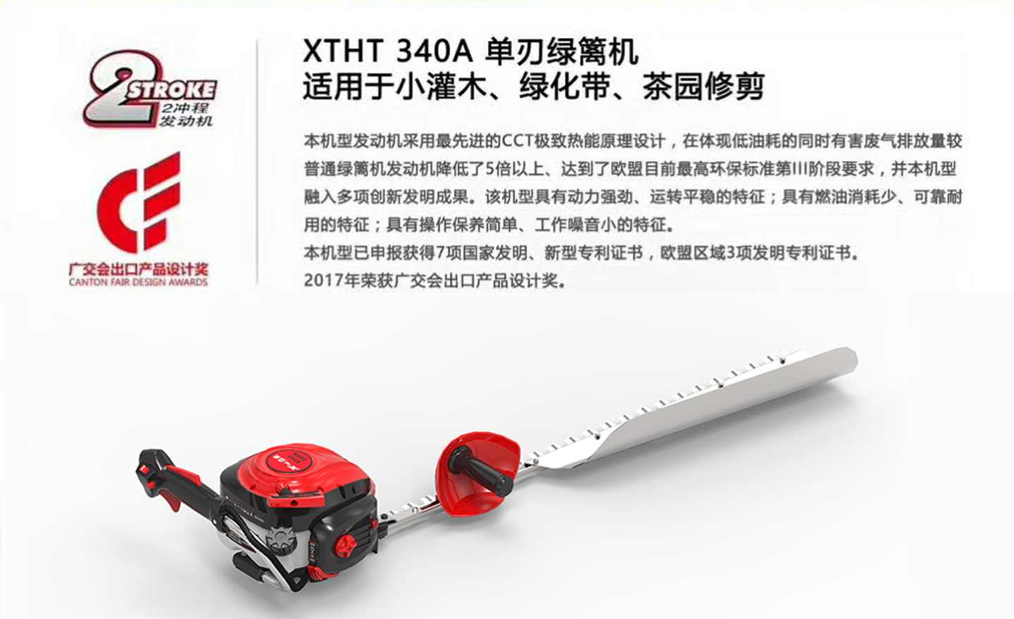 喜泰人这次下乡分享的主要产品是单刃绿篱机XTHT 340A,该款产品是继2017年获得广交会出口产品设计奖的XTHT 340双刃绿篱机之后,在保持优良动力的前提下,自主研发的绿篱新机型。